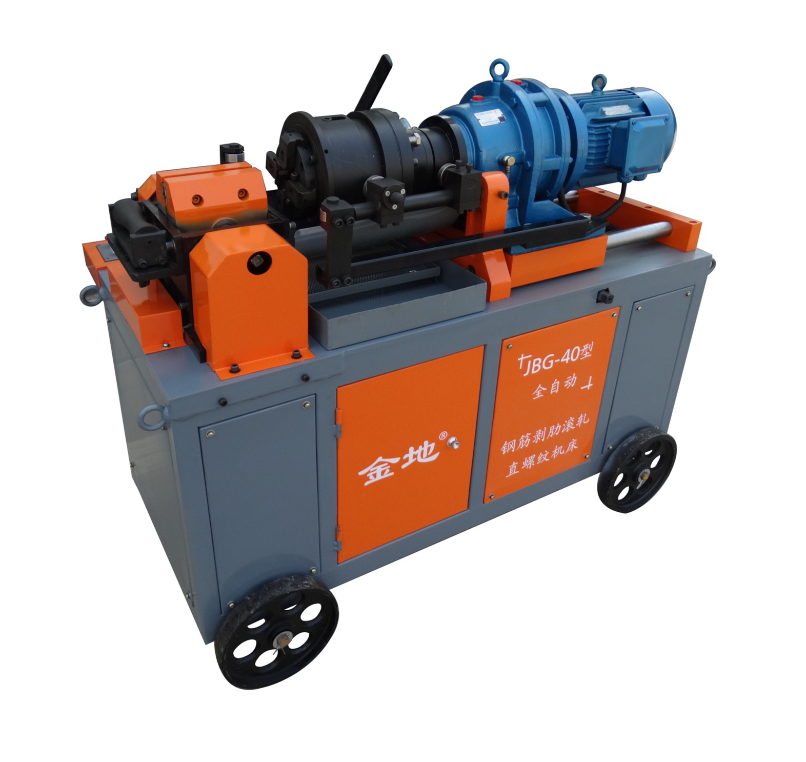 JBG—40型全自動鋼筋剝肋滾軋直螺紋機床,采用PLC可編程控制系統(tǒng),氣動夾緊、進(jìn)給,鋼筋的夾緊、剝肋、滾軋螺紋加工可實現(xiàn)一鍵操作。本機可加工正、反絲扣螺紋,且正、反扣螺紋的加工長度均能達(dá)到120mm。鋼筋剝肋,在直徑φ14—φ40mm范圍內(nèi)可利用剝肋盤自由調(diào)節(jié)定位。(如加工φ14mm、φ16mm鋼筋絲頭需在安裝刀片的4個刀體刀槽內(nèi)加裝1.8mm厚刀墊)。